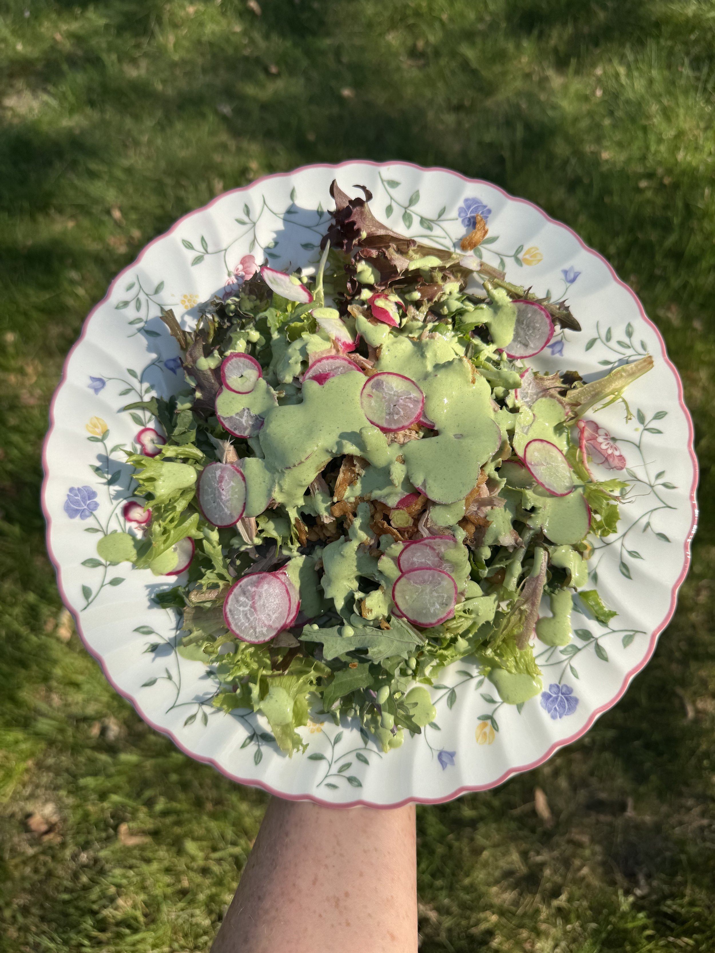 As a proud midwesterner, I’m not afraid to admit that I have an obsession with ranch. Where I’m from, ranch goes on everything - salad, pizza, fries, chicken (maybe one day you’ll get my gramma’s ranch chicken recipe), chips, burgers, veggies, ice cream. Hahaha, okay maybe not ice cream, but you get the gist. As I’ve aged, I’ve given up that classic bottle of ranch and moved on to homemade, it tastes so much better and is surprisingly easy. In this recipe I combined my childhood nostalgia with my “grown up” adoration for spring onions and green garlic. Green Valley Ranch goes great on just about everything. I’ve been enjoying it on salads with fresh Market greens and leftover Crazy Fox VA Style BBQ Chicken (available only on Tuesdays!). I hope you give it a try!