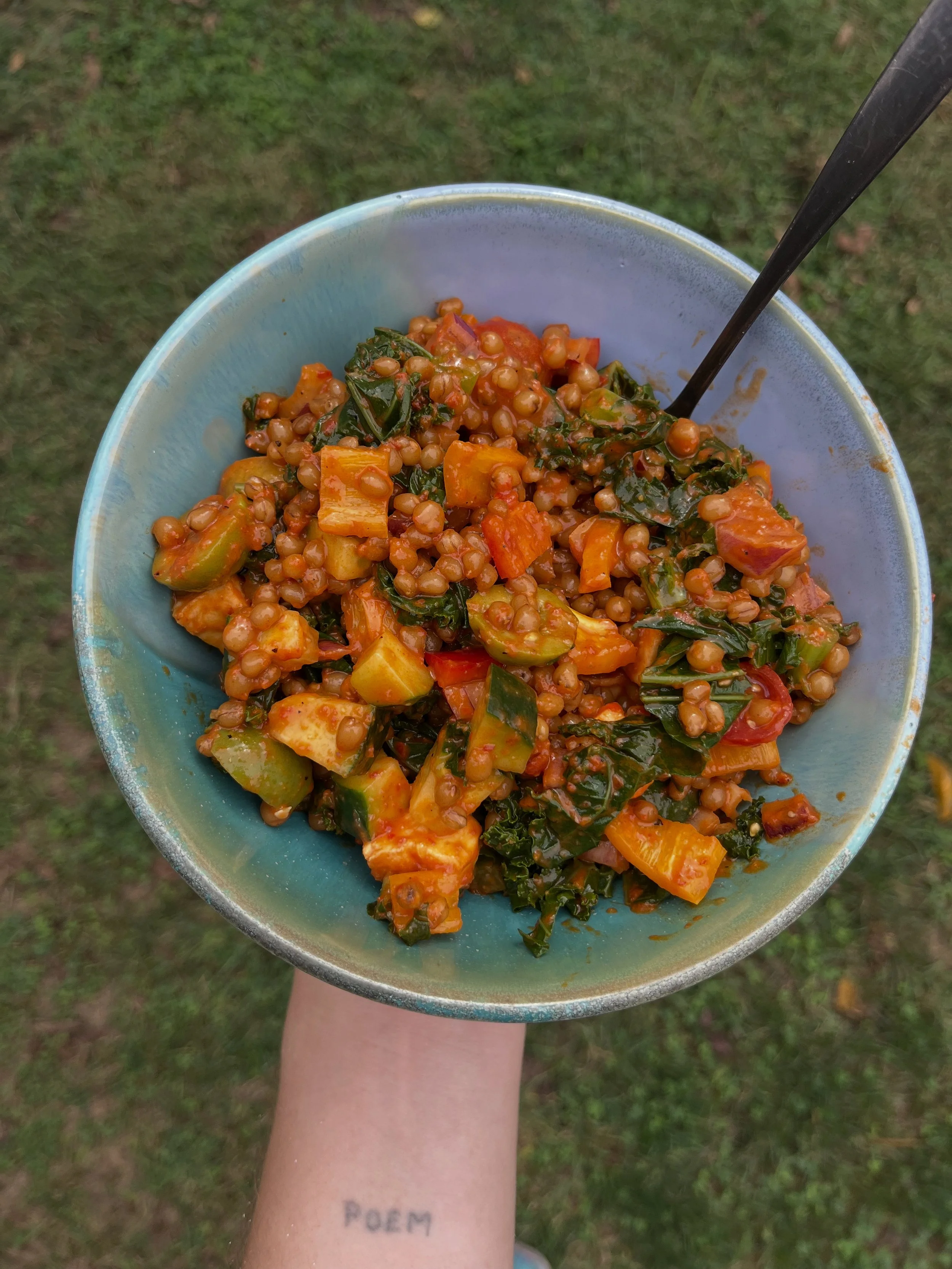 Drain and rinse your grains after soaking and prepare according to the specifications of the grain you’re using. I typically do a 1:2 ratio of grains to salted water, bring them to a boil, and simmer covered until softened. For the hard winter wheat, this took about 30 mins. Soaking the grains cuts down on cooking time and makes them easier to digest. If you’re dairy-tolerant, add a tablespoon of whey or whole milk plain yogurt to your soaking water for a little ferment-y goodness!